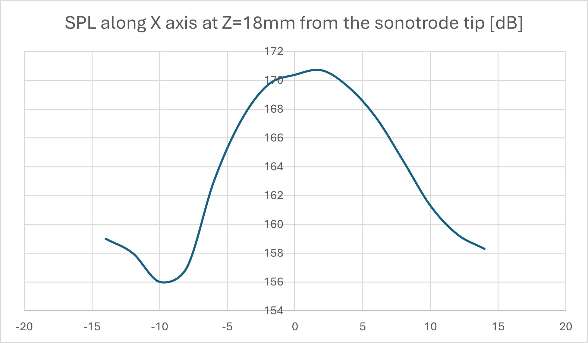 The acoustic pressure field generated by the probe was experimentally characterized in air using a calibrated microphone as shown in Figure 2. Measurements were performed both axially, in front of the radiating tip, and along a transverse plane intersecting the location of maximum acoustic pressure. These measurements provided direct validation of the predicted acoustic field distribution.